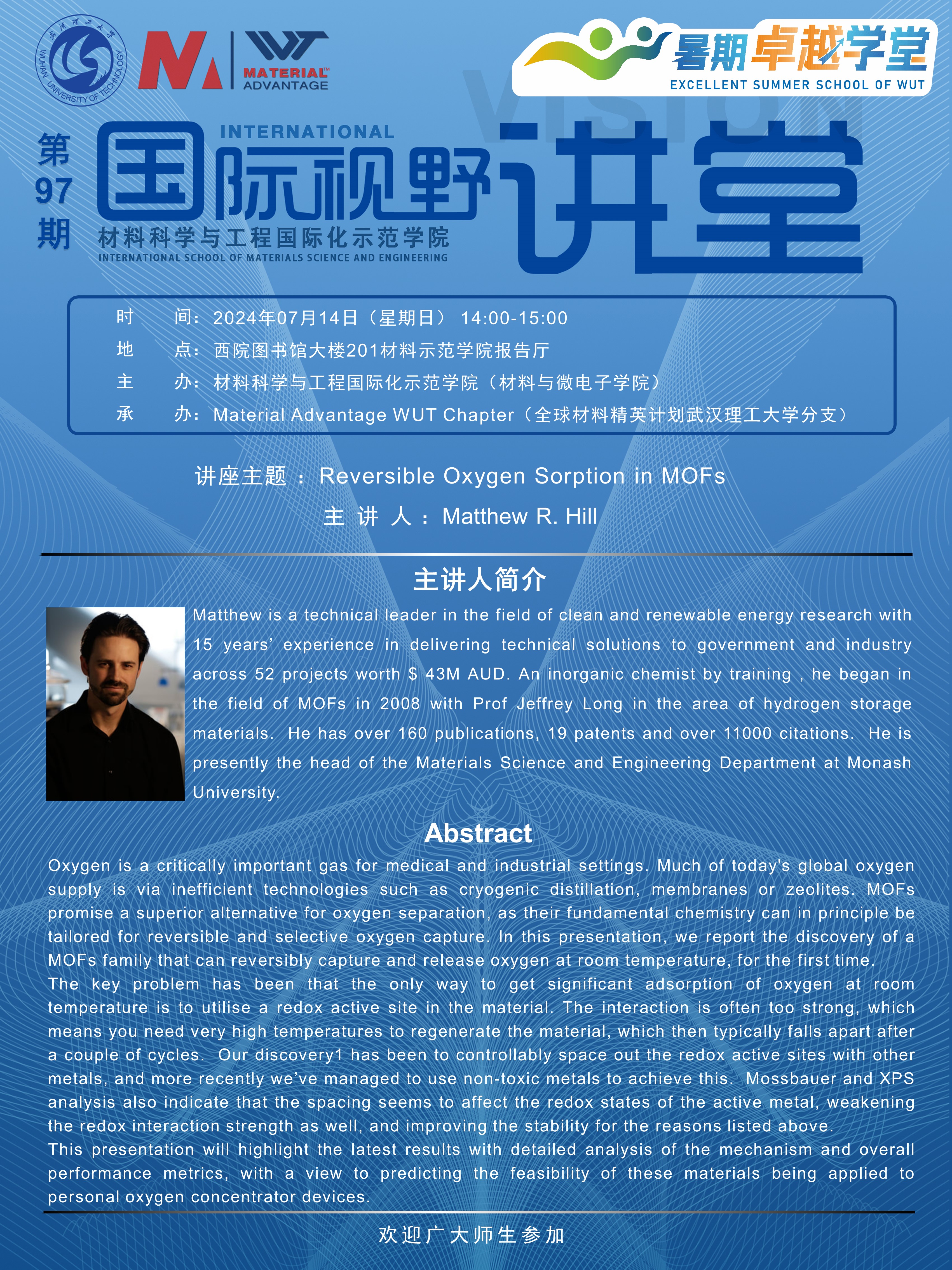 【篮球博彩 暑期卓越学堂】国际视野讲堂第97期:Reversible Oxygen Sorption in MOFs