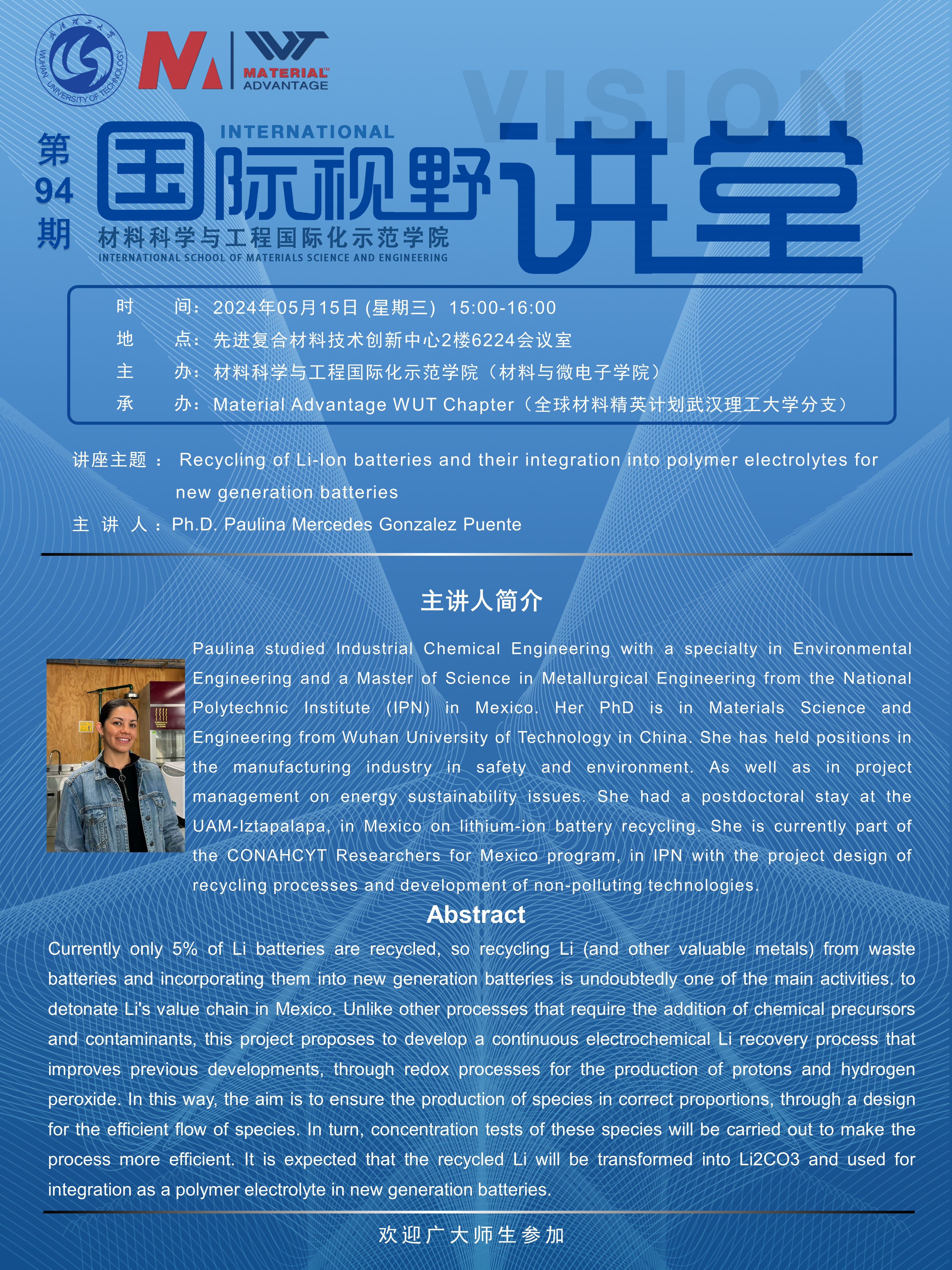 【国际视野讲堂】第94期:墨西哥国立理工大学Paulina Mercedes Gonzalez Puente博士学术报告会