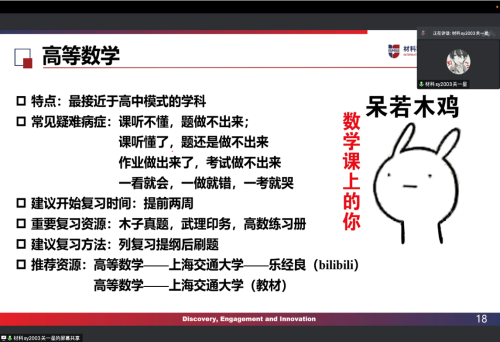 随后,关一星同学对如何进行期末备考进行了具体的阐述,给同学们提出了三点建议:第一,要把握课堂时间;第二,及时进行课后复习;第三,有计划复习备考,适当整理思维导图和知识提纲。在这之后,关一星同学也针对大一同学们的重要课程一一讲解备考方案,包括高等数学、线性代数、C语言、普通化学、思修、英语、材料前沿导论等课程。