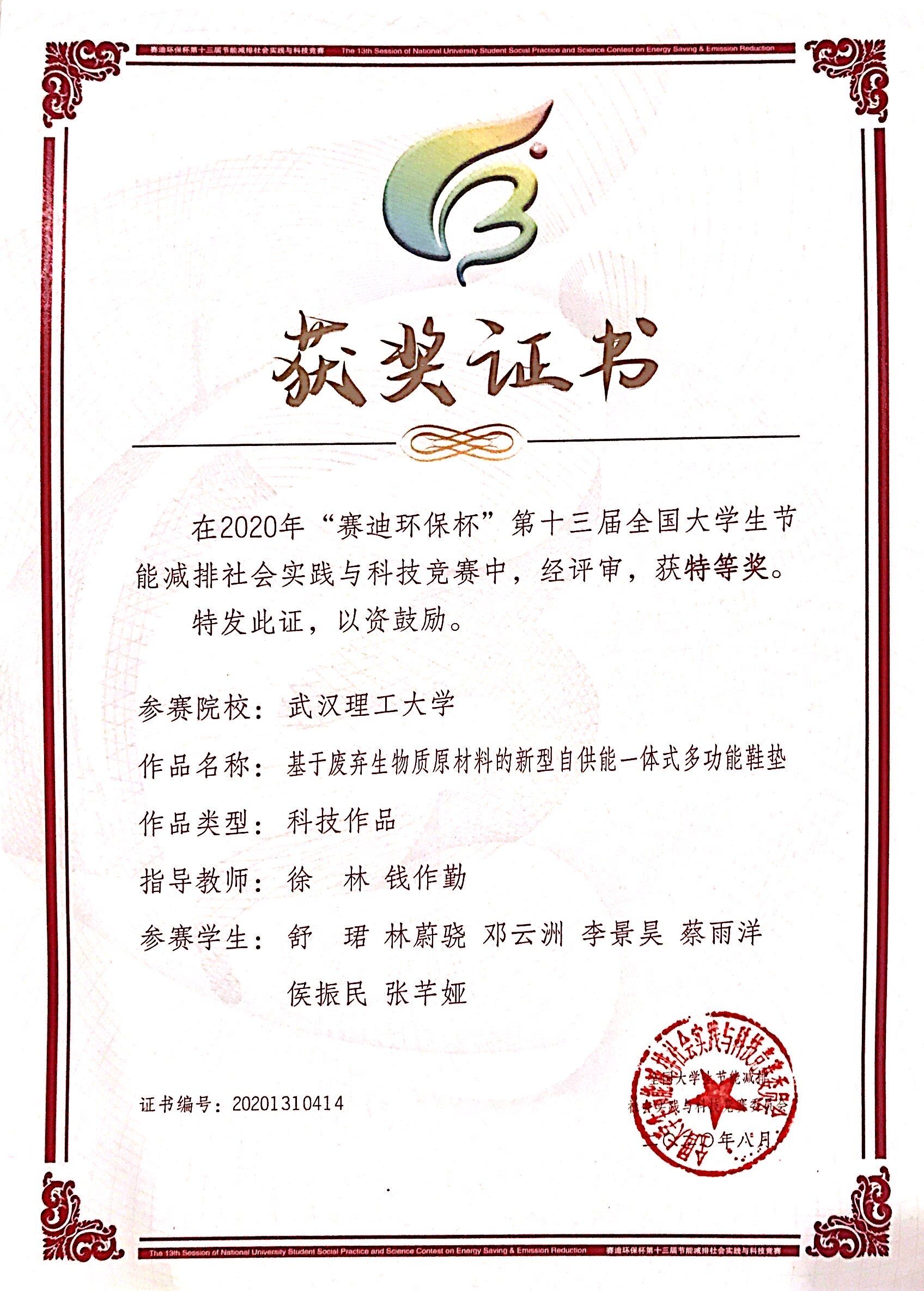 8月29日,由教育部高教司主办,并委托教育部高等学校能源动力学科教学指导委员会举办,重庆大学承办的2020年“赛迪环保杯”第十三届全国大学生节能减排社会实践与科技竞赛决赛落下帷幕。篮球博彩 报送的参赛作品《基于废弃生物质原材料的新型自供能一体式多功能鞋垫》(指导老师:徐林、钱作勤,团队成员:舒珺等)荣获特等奖,实现新突破。