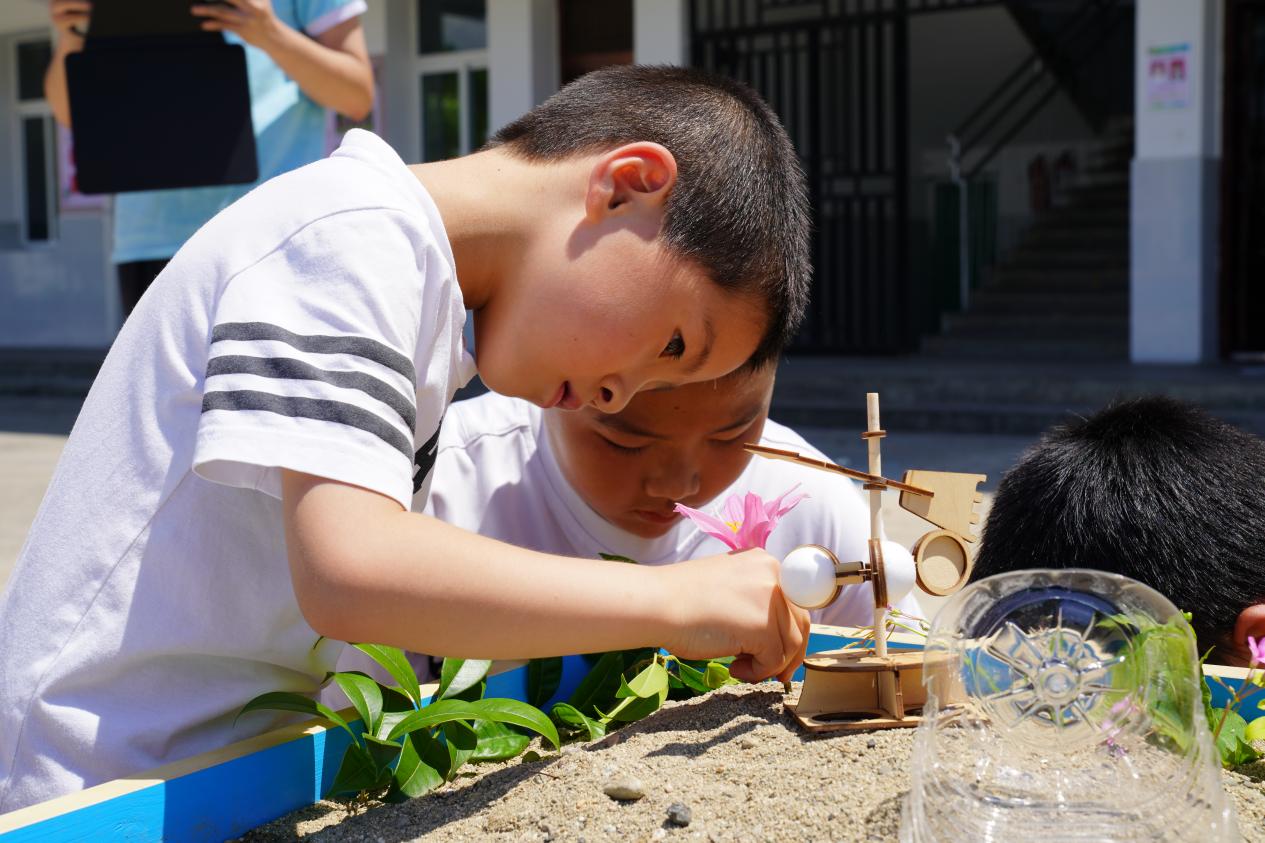 石泉的山、石泉的水、石泉的人共同构筑了“十美石泉”。实践队员们将石泉当地标志性的建筑与风景缩小为一个个的模型呈现在沙盘当中,形成了一个小小的“生态园”:简易的净水排水渠道、太阳能风力系统、科普课上制作的科学小设计……麻雀虽小五脏俱全,同学们纷纷围上前来“这是我们家门口的山!”中池花海的缤纷多彩,广阔天地的风吹麦浪,绵绵远山的朦胧雅致。小小的沙盘虽不能将美丽的石泉全部囊括其中,但亦是这和美乡村的缩影。