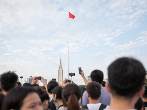 8月1日晨光熹微之时,实践队员到达南昌市八一广场参加“弘扬爱国志 奋进新征程”升旗仪式。6点15分,伴随着嘹亮的口号、铿锵的步伐、磅礴的军乐以及恢弘的国歌声,五星红旗缓缓上升至旗杆最高点,飘扬在英雄城上空,在场队员深受震撼,倍感鼓舞。
