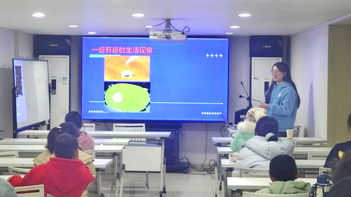 接着,主讲老师便开始科学而又生动易懂地为小朋友们解释水的表面张力的原理,形象地将水分子与水分子之间的张力比作成家人之间手拉手的力量。又进一步借用荷叶上的露珠、硬币上鼓起来的水面、水黾这一神奇的小动物等生活中的例子来帮助同学们理解,也教会他们如何用学到的科学知识解释生活中一些神奇的现象。